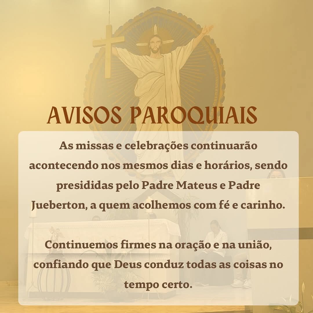 De acordo com o aviso paroquial, as missas e celebrações continuarão acontecendo nos mesmos dias e horários, agora presididas pelos padres Mateus e Jueberton, “a quem acolhemos com fé e carinho”.