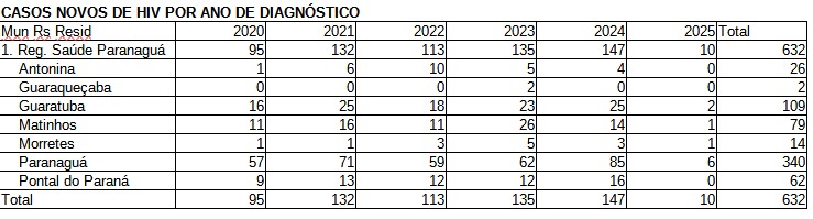 Apenas em janeiro de 2025, foram registrados 10 novos casos de HIV na região, sendo seis em Paranaguá, dois em Guaratuba, um em Matinhos e um em Morretes.