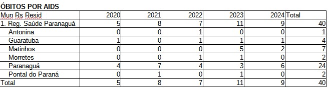 Além do aumento dos casos, a mortalidade por Aids no Litoral do Paraná também acendeu um alerta, com 40 óbitos registrados entre 2020 e 2024. Novamente, Paranaguá lidera as estatísticas, com 24 mortes no período.
