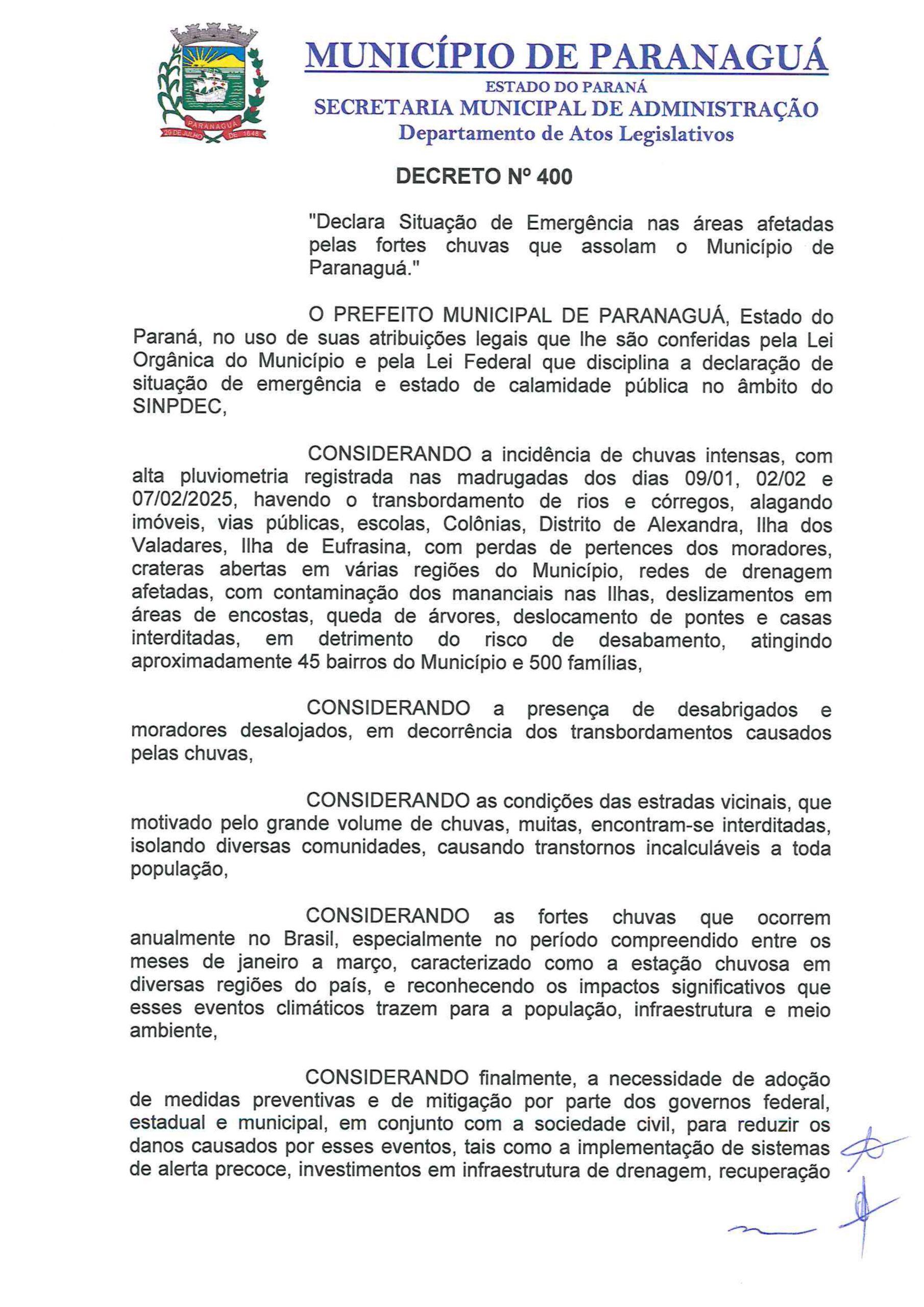 A cidade de Paranaguá foi atingida por fortes chuvas no último fim de semana (7 e 8) resultando em alagamentos, deslizamentos e diversos transtornos para a população. Diante deste cenário, a Prefeitura publicou, nesta segunda-feira (10), o Decreto nº 400, declarando Situação de Emergência no município.