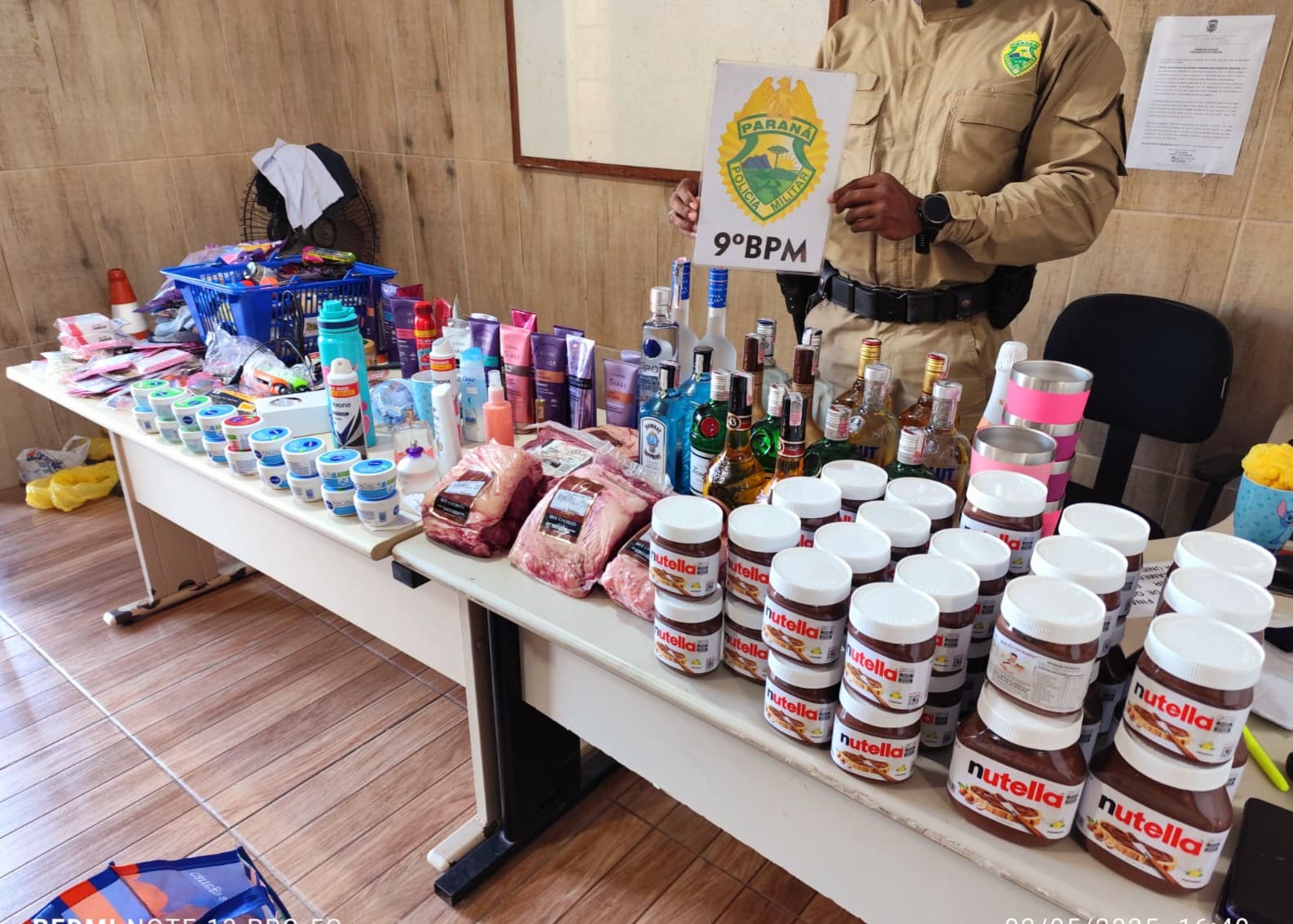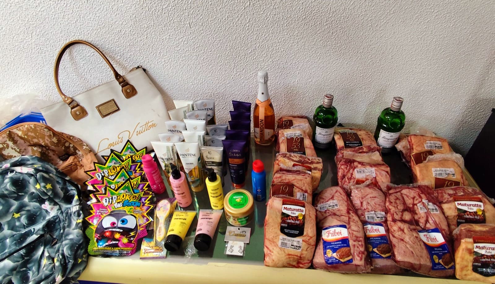Peças de picanha, várias garrafas de bebidas alcoólicas, produtos de higiene e limpeza, potes com creme de avelã, doces, copos térmicos, bolsas, entre outras mercadorias, furtadas na tarde desta sexta-feira, 2, em estabelecimentos comerciais na cidade de Matinhos, foram recuperados pela Polícia Militar.