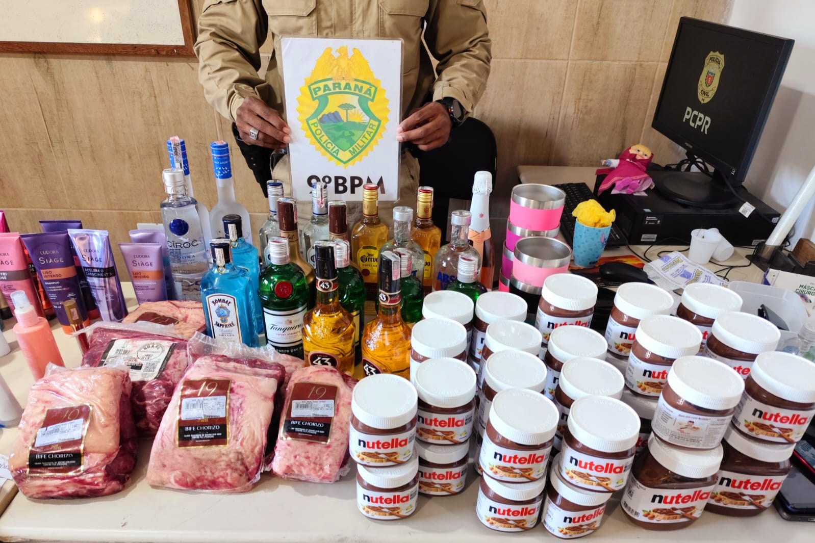 Peças de picanha, várias garrafas de bebidas alcoólicas, produtos de higiene e limpeza, potes com creme de avelã, doces, copos térmicos, bolsas, entre outras mercadorias, furtadas na tarde desta sexta-feira, 2, em estabelecimentos comerciais na cidade de Matinhos, foram recuperados pela Polícia Militar.