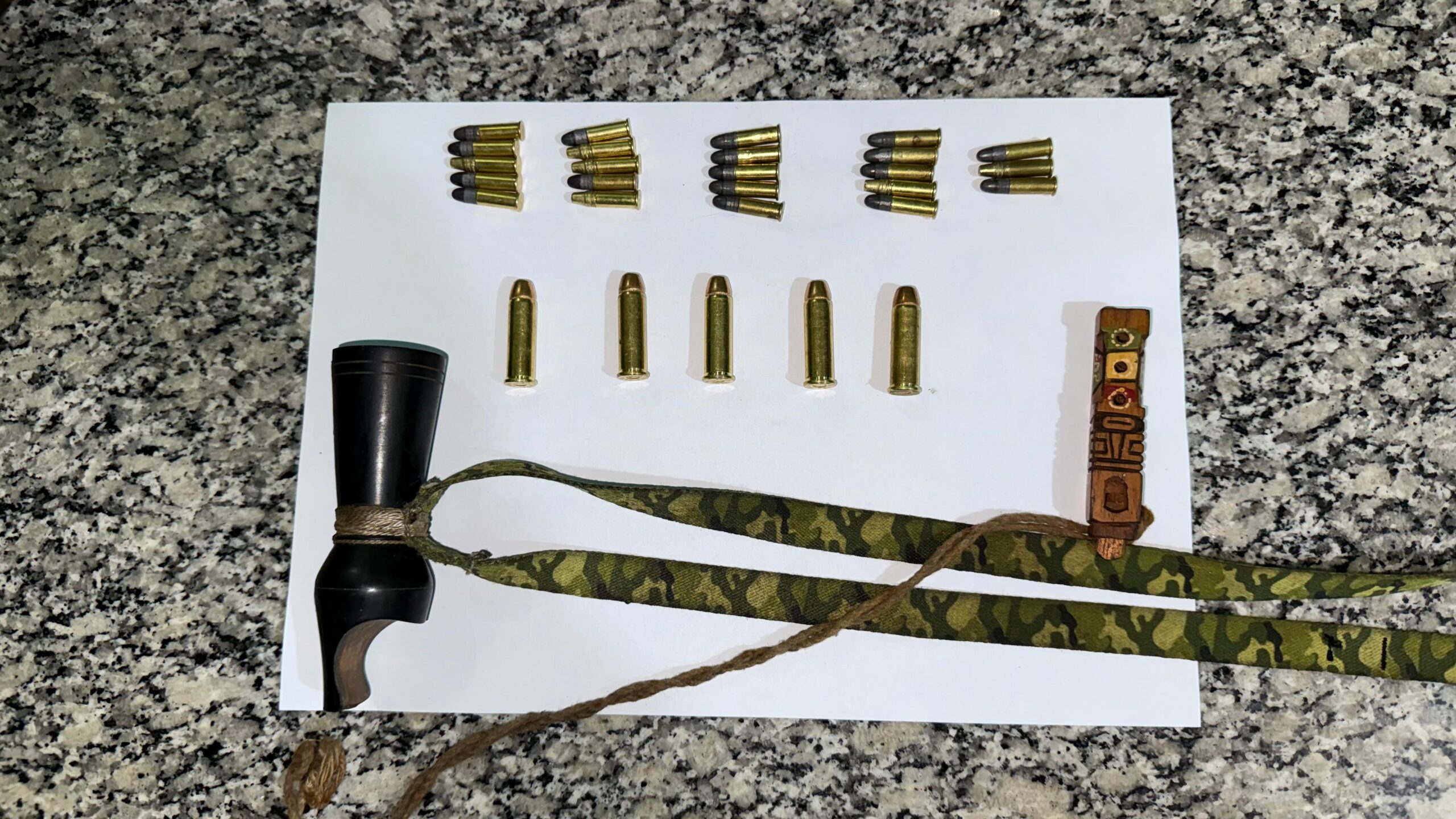 Dentro da canoa foi encontrada uma carabina artesanal calibre .22, com silenciador, 23 munições calibre .22, cinco munições calibre .38 e dois pios, apitos para chamar pássaros utilizados na prática de caça ilegal.