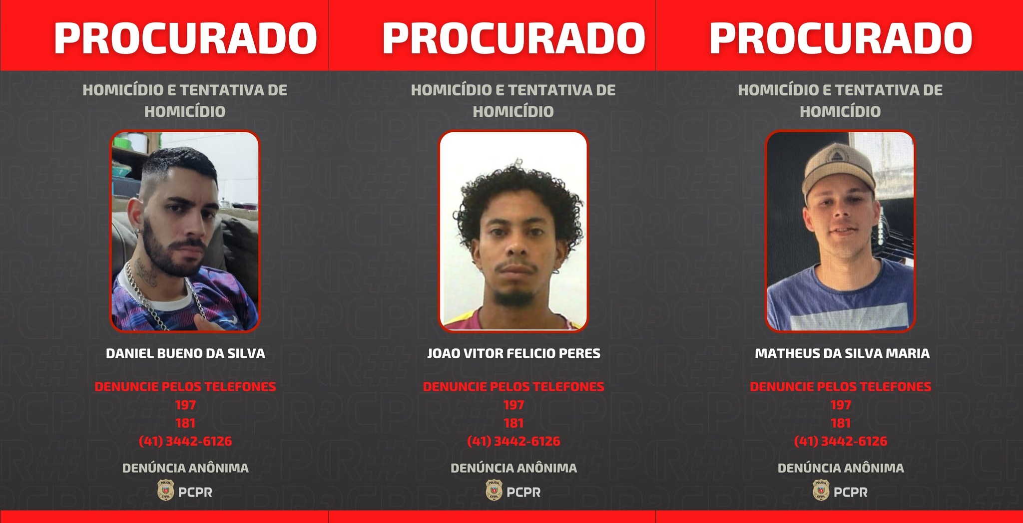A Polícia Civil do Paraná divulgou nesta terça-feira, 3, imagens de três homens foragidos pela prática do crime de homicídio e tentativa de homicídio, ocorrido no dia 16 de fevereiro deste ano, em Guaratuba.