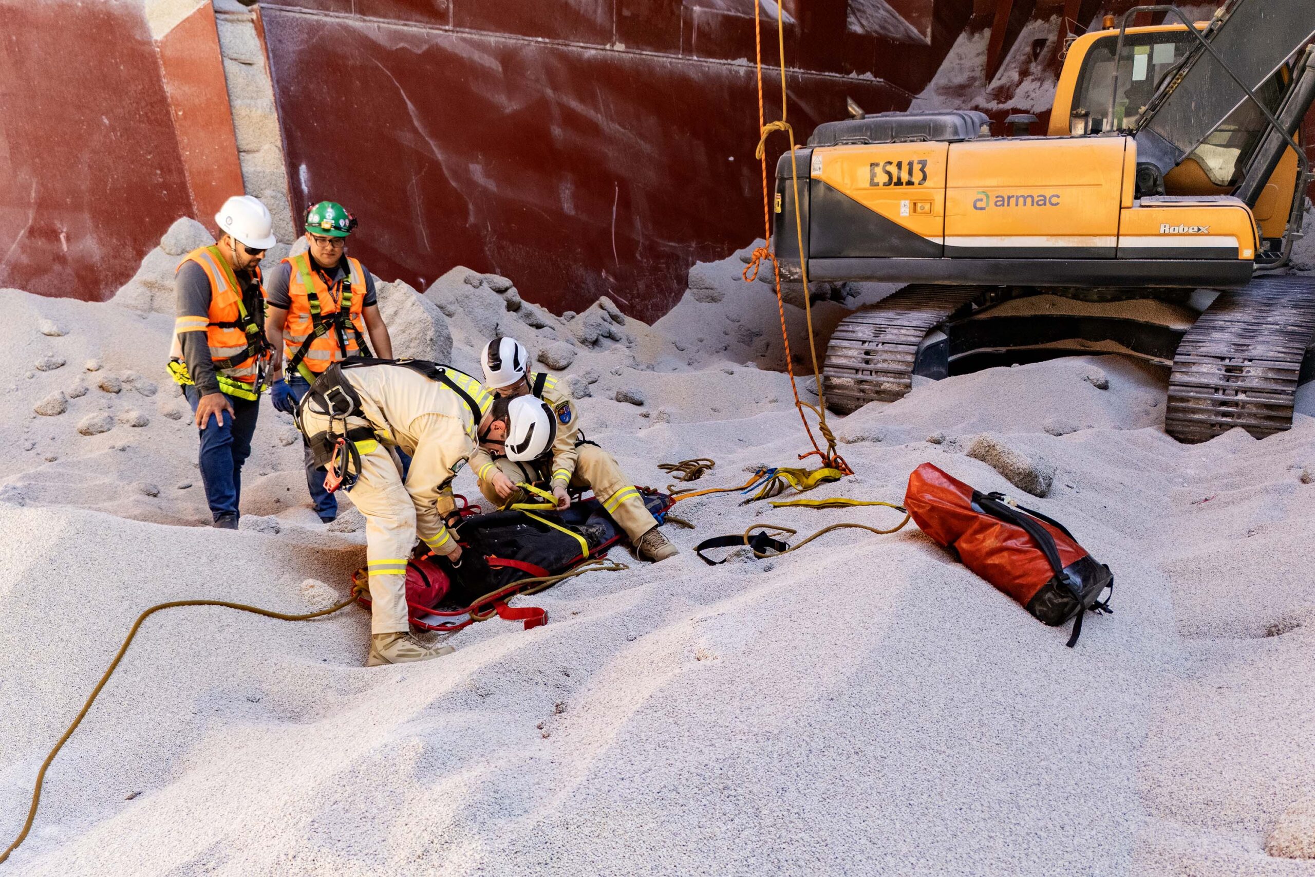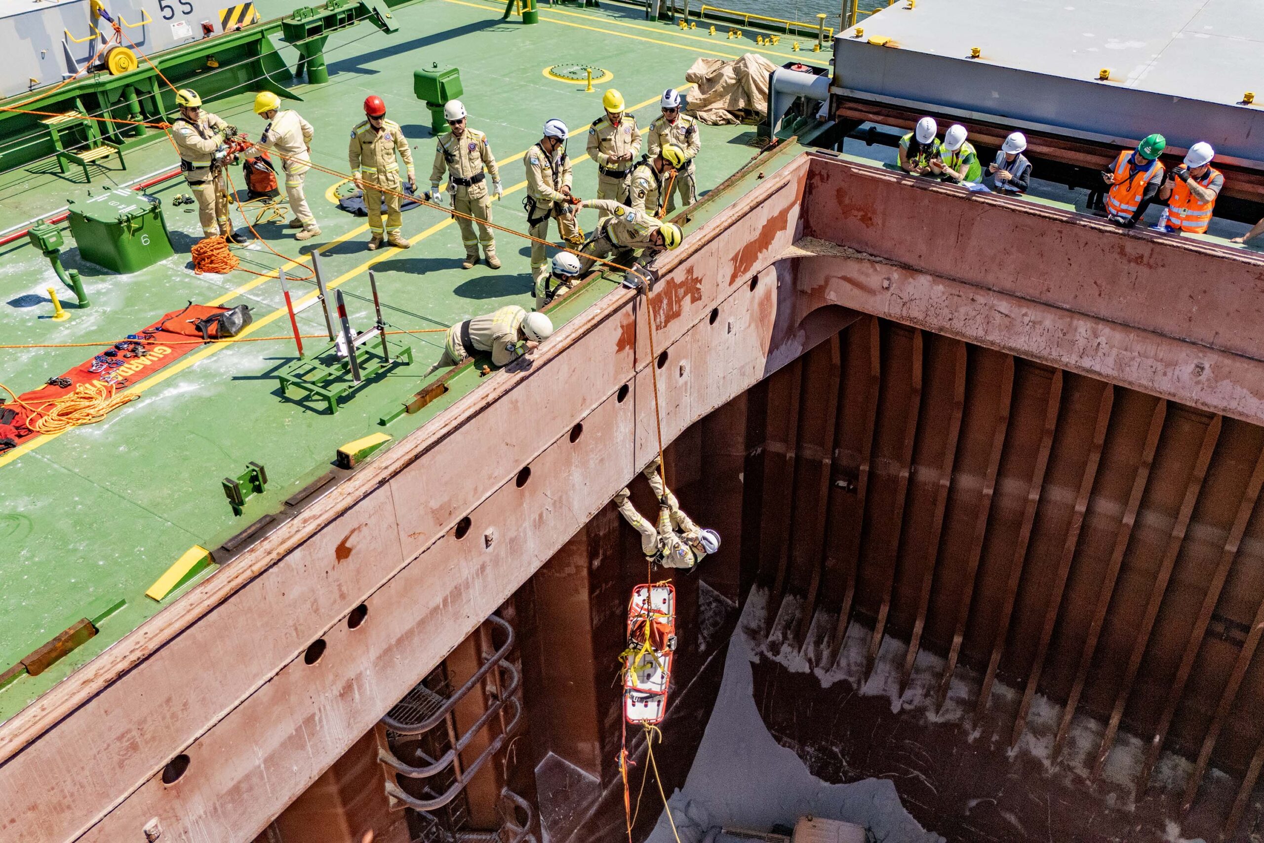A simulação ocorreu a bordo do navio Uranus e teve como objetivo testar métodos de salvamento em embarcações que não possuem guindastes. O cenário montado reproduziu um acidente em um dos porões, onde um trabalhador, representado por um manequim, necessitava de resgate.