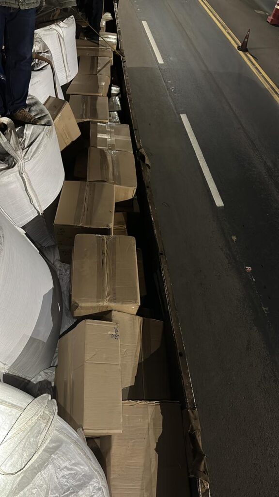 Durante a abordagem, o motorista, de 54 anos, apresentou a equipe de fiscalização notas fiscais de uma transportadora de Foz do Iguaçu e declarou que transportava fertilizantes até Paranaguá.