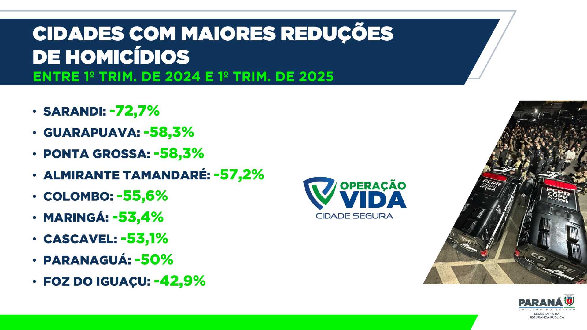 “Mesmo depois de um ano histórico como 2024, seguimos derrubando os índices de criminalidade. Isso mostra o compromisso permanente com a proteção da população paranaense”, destacou.