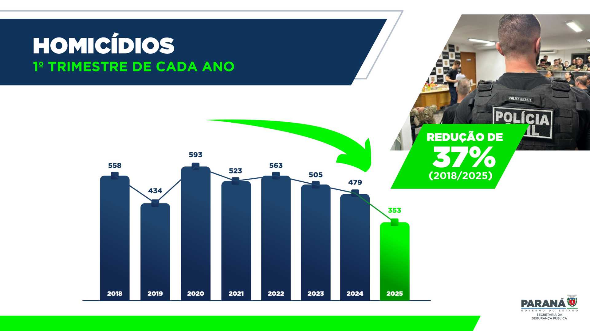 A melhoria dos índices de segurança pública do Paraná em 2025, que superaram até mesmo as marcas recordes obtidas em 2024, seguem uma tendência iniciada em 2019 no Estado. Do 1.º trimestre de 2018, ano anterior ao início da atual gestão estadual atual, até o 1.º trimestre de 2025, a queda nas ocorrências foi generalizada.
