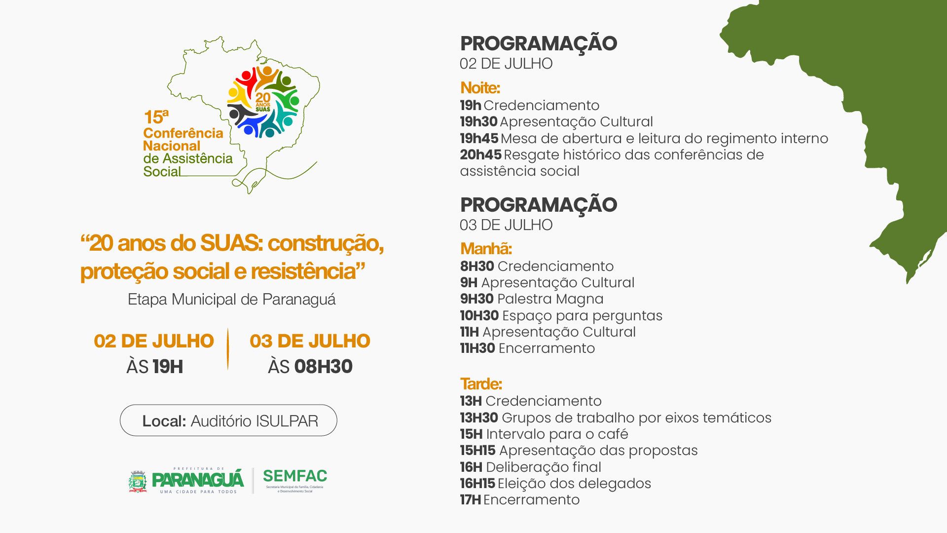 A Prefeitura de Paranaguá por meio da Secretaria Municipal da Família da Prefeitura de Paranaguá (Semfac) promove a 15ª Conferência Municipal de Assistência Social de Paranaguá. O evento busca trazer um espaço democrático e parcipativo para debater os avanços e desafios do Serviço Único de Assistência Social (SUAS).