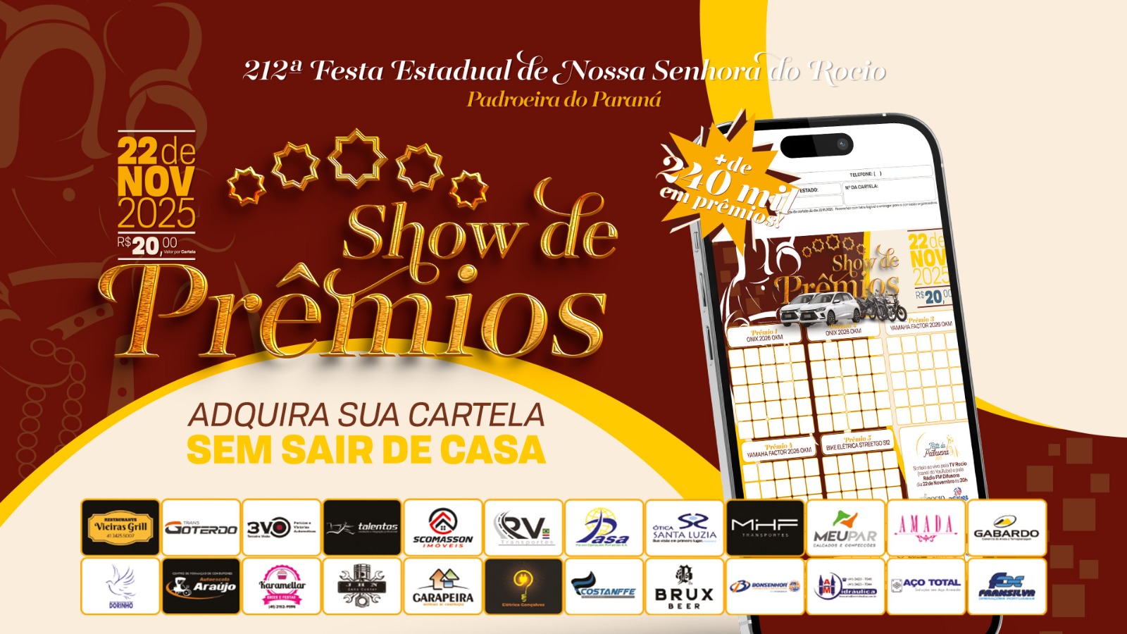 O tradicional Show de Prêmios da 212ª Festa Estadual de Nossa Senhora do Rocio, em Paranaguá, já iniciou as vendas das cartelas. Neste ano, serão sorteados mais de R$ 240 mil em prêmios, incluindo carros, motos e uma bicicleta elétrica.