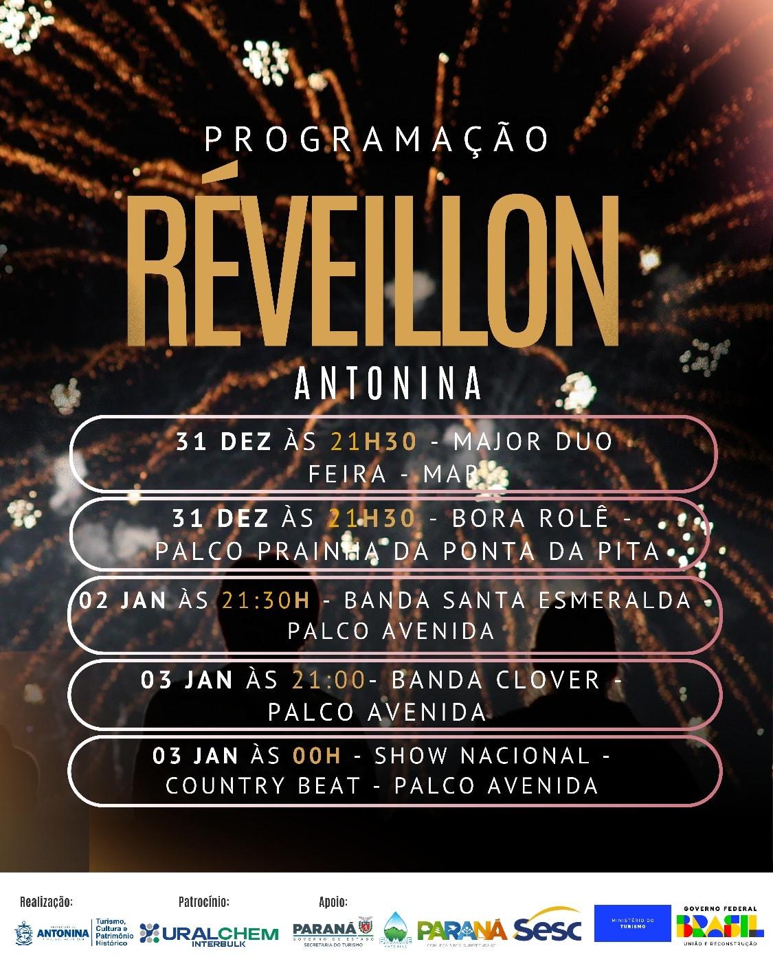 No dia 31, às 21h30, a cidade recebe o show do Major Duo, na Feira-Mar, e da banda Bora Rolê, na Ponta da Pita. No dia 2 de janeiro, às 21h30, a Banda Santa Esmeralda se apresenta no Palco Avenida. No dia 3 de janeiro, a programação em Antonina começa às 21h com a Banda Clover e segue até meia-noite com o show nacional da banda Country Beat.
