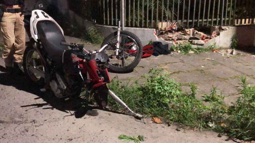 A Honda Falcon NX 400, nas cores vermelha e preta, pilotada pela vítima, ficou completamente destruída.