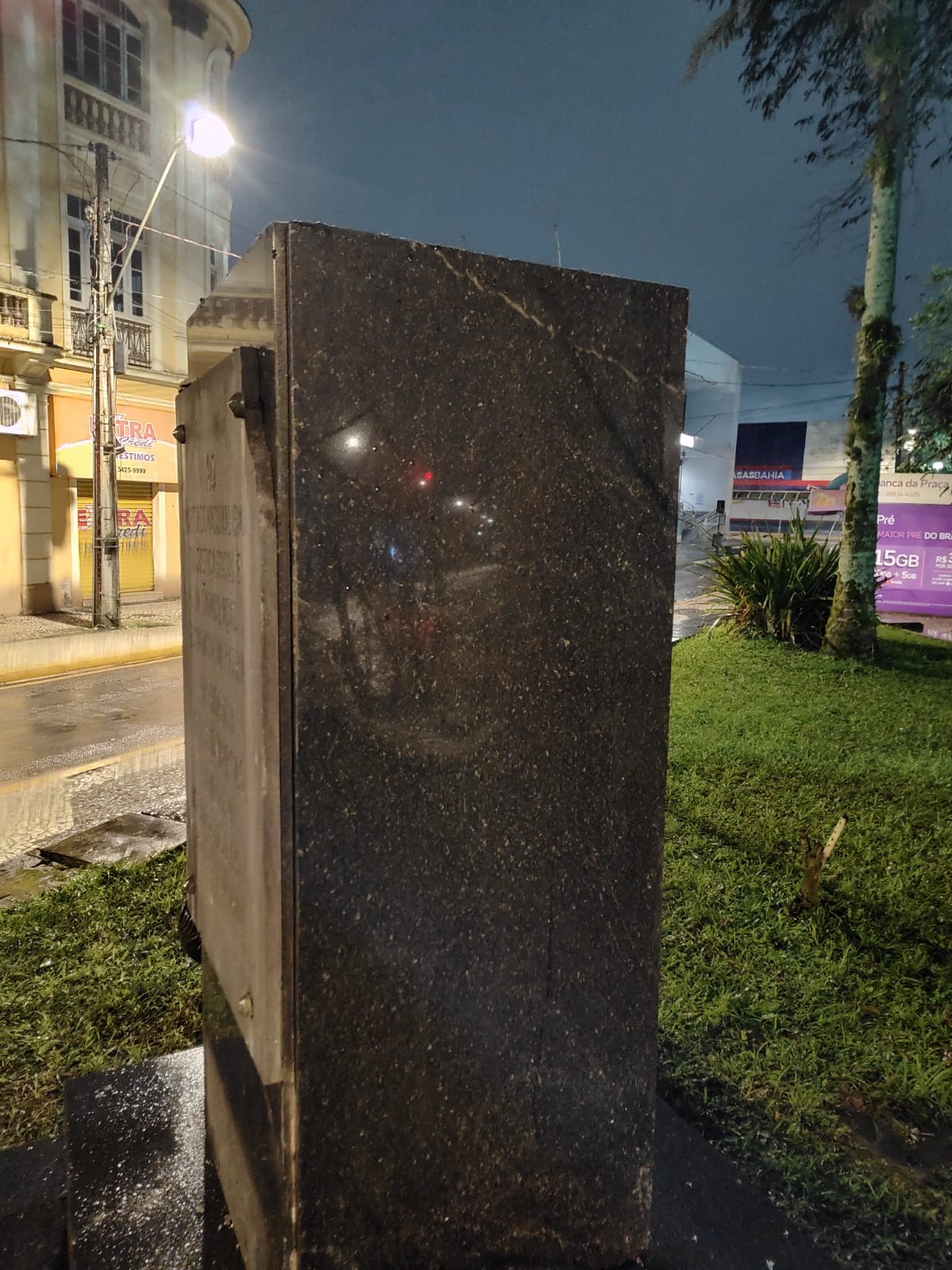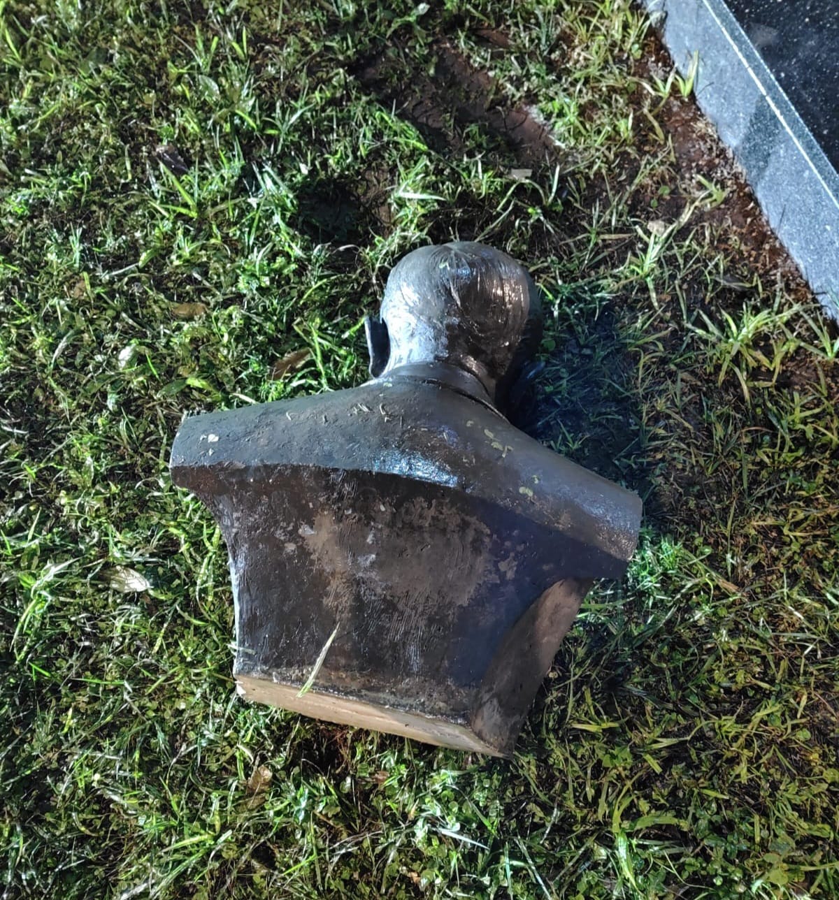 A estrutura em granito, onde estava o busto, foi danificada e placas do material foram arrancadas.