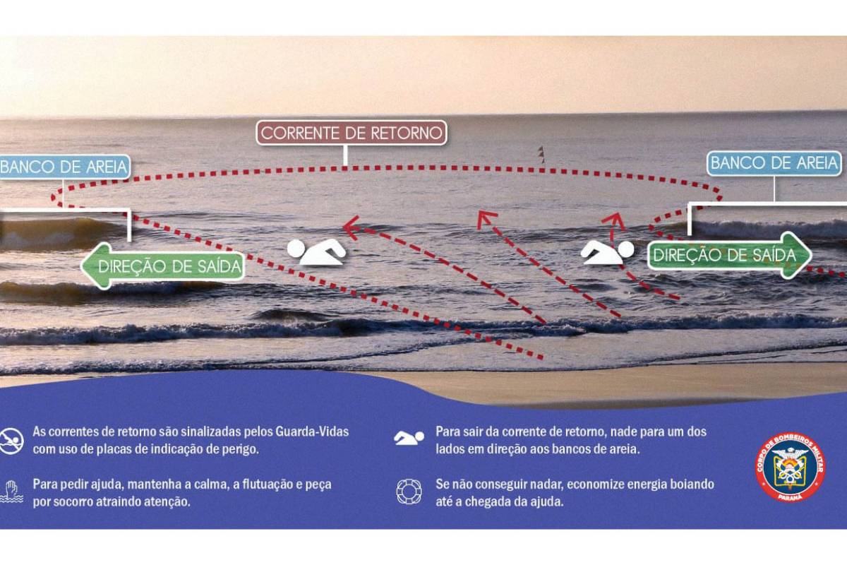 O Corpo de Bombeiros Militar do Paraná (CBMPR) reforça aos turistas de férias no Litoral que é preciso estar atento às correntes de retorno no mar, um fenômeno responsável por muitos incidentes de afogamento. Este tipo de corrente é formada pelo retorno da água que chega à faixa de areia com as ondas.